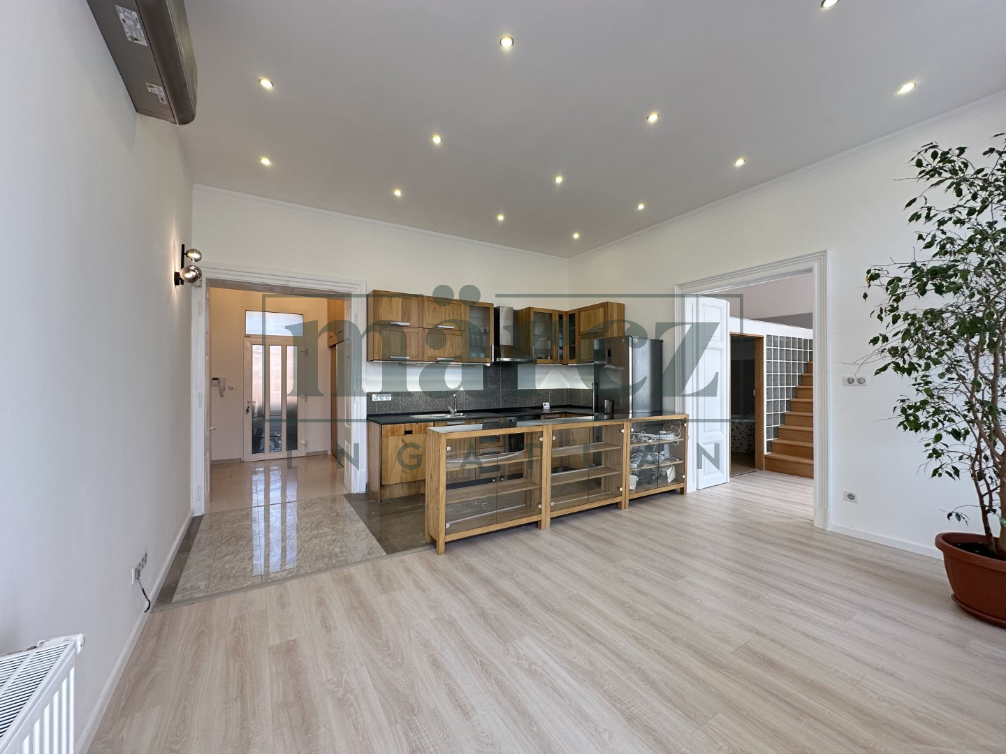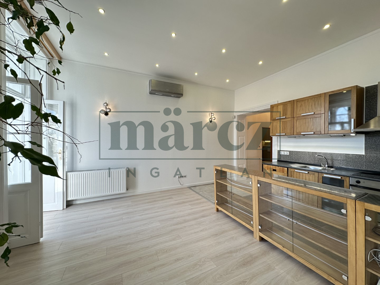 Bip-004428. Belváros szívében (Zichy Liget), zöldövezetben téglaépület 1 emeletén kiadó, nappali + 1 szoba + galéria elosztású, bútor nélküli és részben gépesített, 68 nm-es igényesen felújított, polgári jellegű, klimatizált, erkélyes lakás iroda céljára.